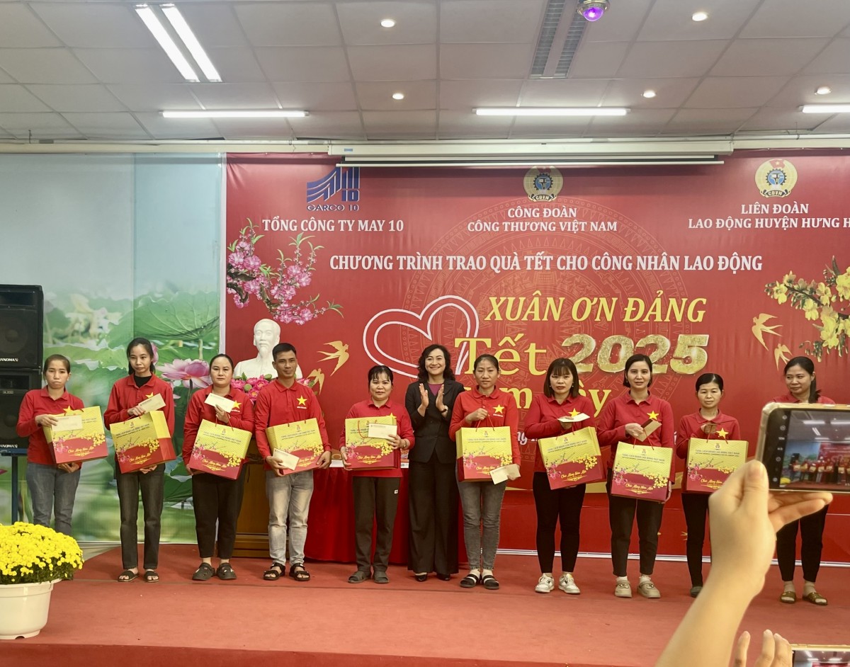 | Lãnh đạo Bộ Công Thương tặng quà đoàn viên, người lao động Xí nghiệp may Veston Hưng Hà (thuộc Tổng công ty May 10 - CTCP). Ảnh: Hoàng Lan |