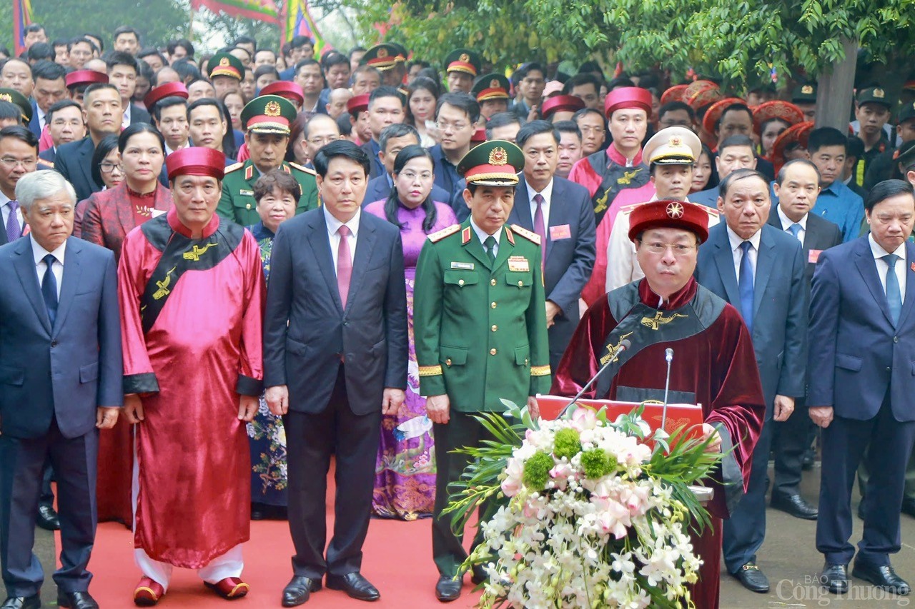 | Chủ tịch nước Lương Cường cùng các đồng chí là Ủy viên Bộ Chính trị dâng hương bày tỏ lòng thành kính với các bậc Vua Hùng. Ảnh: Lê Hoàng |