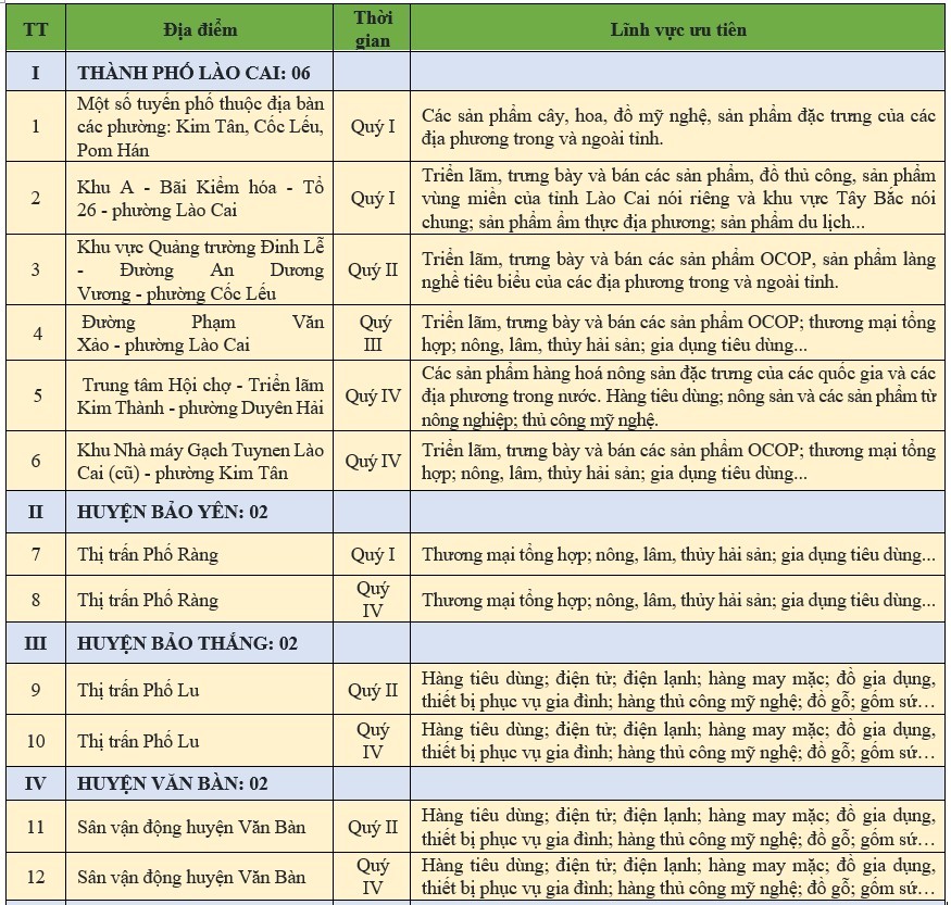 Lĩnh vực ưu tiên được tổ chức hội chợ, triển lãm thương mại tại các huyện, thị xã, thành phố trên địa bàn tỉnh năm 2025 gồm: Các sản phẩm cây, hoa, đồ mỹ nghệ, sản phẩm đặc trưng của các địa phương trong và ngoài tỉnh; các sản phẩm đồ thủ công, sản phẩm vùng miền của tỉnh Lào Cai và khu vực Tây Bắc; sản phẩm ẩm thực địa phương; sản phẩm du lịch; các sản phẩm OCOP, sản phẩm làng nghề tiêu biểu; thương mại tổng hợp; nông, lâm, thủy hải sản; các sản phẩm hàng hoá nông sản đặc trưng của các quốc gia và các địa phương trong nước; nông sản và các sản phẩm từ nông nghiệp; điện tử; điện lạnh; hàng may mặc; đồ gia dụng, thiết bị phục vụ gia đình; đồ gỗ; gốm sứ; mây tre đan; trang thiết bị thể thao; đồ uống giải khát; đồ uống năng lượng - dinh dưỡng; y tế; khách sạn…