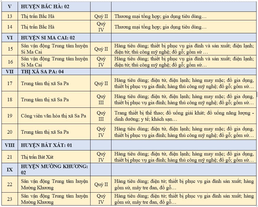 Theo đó trong năm 2025 có 23 hội chợ, triển lãm thương mại sẽ được tổ chức trên địa bàn 9 huyện, thị xã, thành phố (thành phố Lào Cai 6; thị xã Sa Pa 4; huyện Bảo Yên 2; huyện Bảo Thắng 2; huyện Văn Bàn 2; huyện Bắc Hà 2; huyện Si Ma Cai 2; huyện Bát Xát 1; huyện Mường Khương 2).
