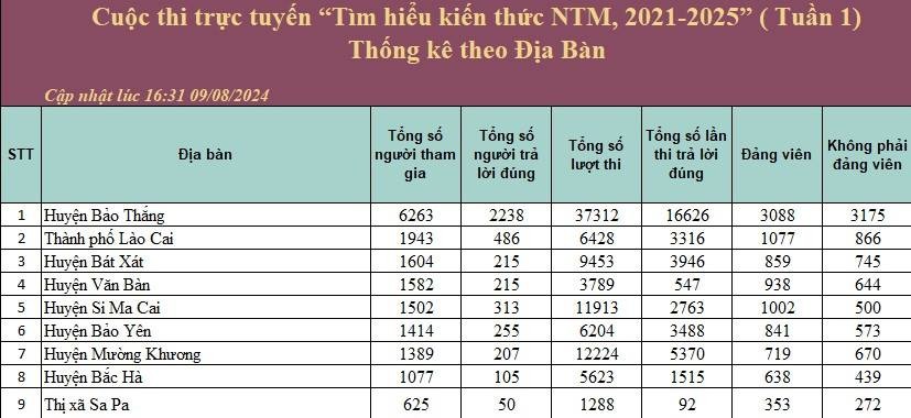 Theo thông tin từ Văn phòng Điều phối nông thôn mới tỉnh Lào Cai cơ quan thường trực chương trình tổ chức Cuộc thi trực tuyến “Tìm hiểu kiến thức nông thôn, giai đoạn 2021-2025”, cho biết: Kết thúc đợt thi Tuần 1, tính đến 16h31’ ngày 09/8/2024, cuộc thi đã thu hút tổng số 17.435 người tham gia thi, trong đó, toàn tỉnh có 17.399 người tham gia thi; trên 95.500 lượt thi; tổng số lượt thi đúng trên 38.400 lượt; tổng số người đạt điểm tối đa là 4.088 người.