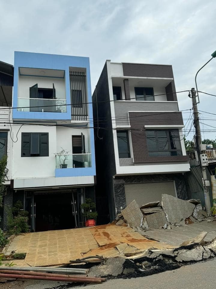 Hiện trường tại đây cho thấy, nhiều ngôi nhà, trong đó có nhà mới xây đã bị nghiêng ra phía sau. Ở phía trước dãy nhà, đất trồi lên làm bong tróc gạch dưới nền nhà.
