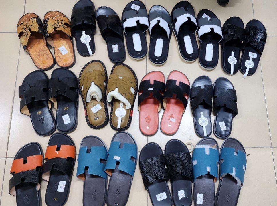 Cụ thể, ngày 5/8, kết quả kiểm tra Hộ kinh doanh Hoàng Thị Hải Hoàn đang trưng bày để bán hàng hóa giả mạo nhãn hiệu đang được bảo hộ tại Việt Nam gồm: 28 đôi giầy thể thao NIKE; 37 đôi giầy thể thao ADIDAS; 13 đôi dép lê nam đế cứng HERMES.