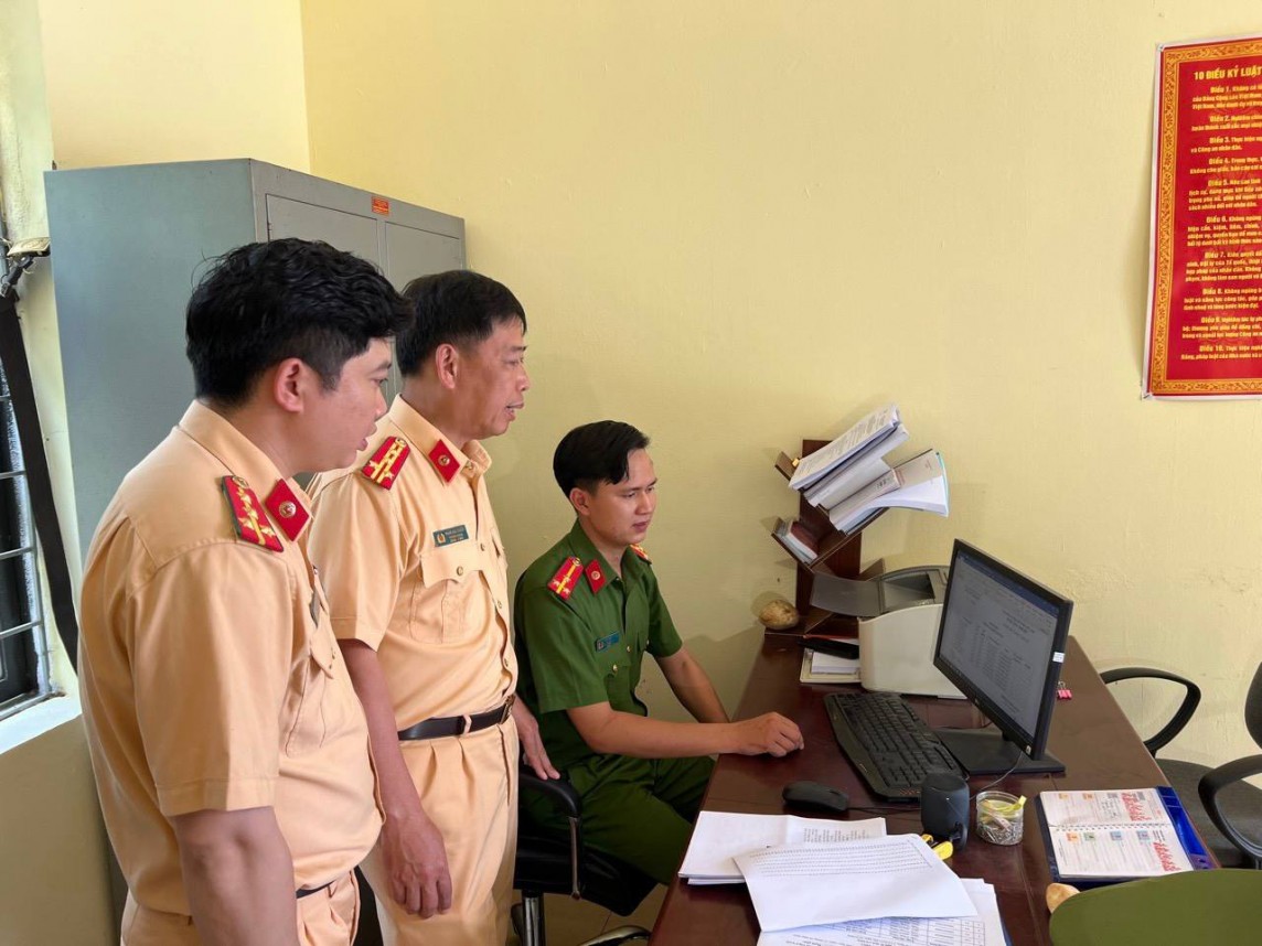 Lãnh đạo Phòng Cảnh sát giao thông Công an tỉnh Lào Cai kiểm tra công tác đăng ký xe qua dịch vụ công toàn trình tại Công an các xã (Ảnh: CALC) |