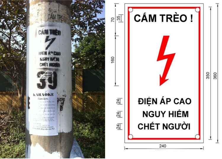 Cột điện trong Khu Công nghiệp Đình Trám, Bắc Giang (trái) - Biển báo an toàn điện chuẩn theo Thông tư 31 (phải)