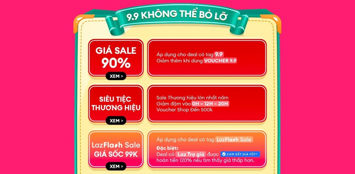 9/9 năm nay hứa hẹn sẽ là “ngày đẹp trời để săn sale” cho mọi tín đồ Lazada với mức giảm cực sốc lên đến 90%. Loạt thương hiệu chính hãng yêu thích từ đa dạng ngành hàng sẽ đổ bộ trên Lazada tại “siêu tiệc thương hiệu” lớn nhất năm. Người tiêu dùng có thể mở app ngay vào các khung giờ vàng như 0h-12h-20h để chốt đơn, và thu thập voucher giảm giá lên đến 500.000 từ các gian hàng.