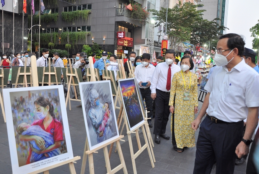 Ngoài những xuất bản phẩm viết về đại dịch Covid-19 tại Lễ hội Đường sách Tết sẽ trưng bày bộ tranh của họa sĩ Lê Sa Long “Sài Gòn thời giãn cách” gồm gần 40 bức tranh với chất liệu arcylic - pastel và màu nước, chỉ đơn giản là những tranh vẽ ghi lại nhịp sống của TP. Hồ Chí Minh trong những ngày giãn cách xã hội, phòng chống dịch Covid-19; những hình ảnh của ATM oxy, ATM thực phẩm…