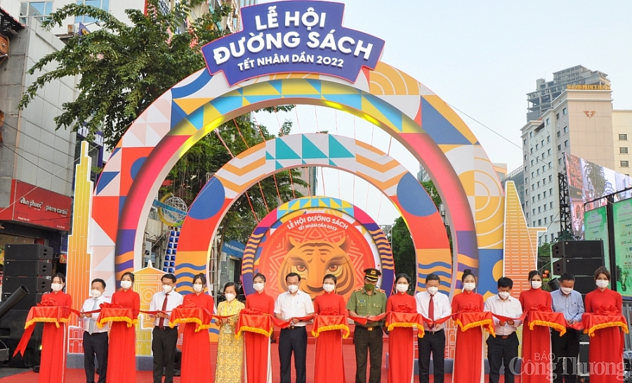 Lãnh đạo TP. Hồ Chí Minh cùng các đại biểu thực hiện nghi thức cắt băng khai mạc Lễ hội Đường sách Tết Nhâm Dần 2022 |