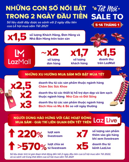 Lượt xem LazLive tăng 220% và lượt chia sẻ livestream cũng tăng hơn 570% cho thấy người dùng đón nhận rất hào hứng và tích cực với các nội dung mua sắm kết hợp giải trí độc đáo về Tết trên Lazada. (Số liệu LazLive được tính từ giai đoạn khởi động đến hết 2 ngày đầu tiên của Lễ hội mua sắm Tết 2022, và so sánh với Cùng thời điểm của Lễ hội mua sắm Tết 2021).