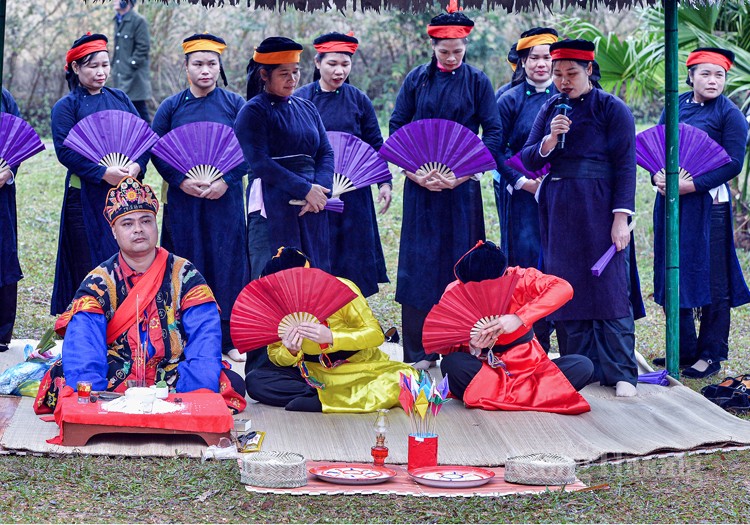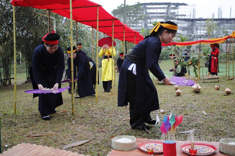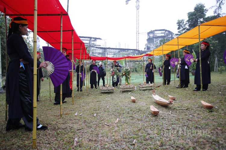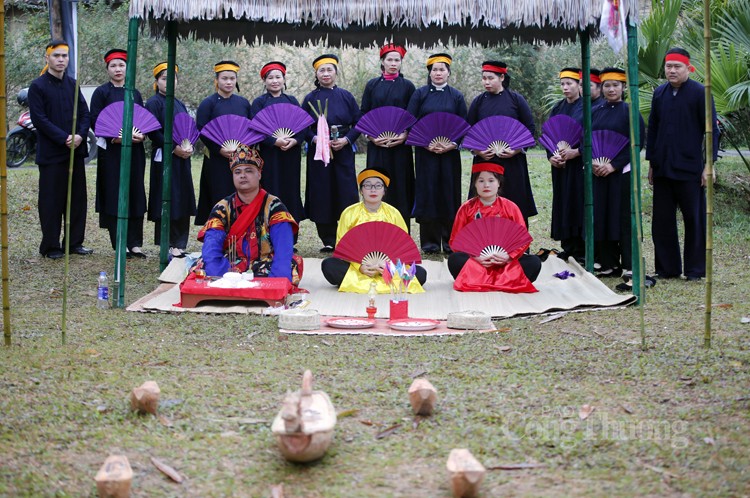 | Thầy Tào, Mẻ Cốc, Cường, Sở và các mụ nàng, mụ nọi và hai thanh niên thực hành nghi lễ |