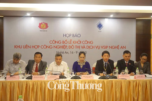 Tham gia buổi họp báo có bà Đinh Thị Lệ Thanh - Ủy viên BTV - Phó Chủ tịch UBND tỉnh, ông Lê Bá Hùng – Ủy viên BTV - Trưởng ban Tuyên giáo tỉnh ủy, ông Võ Văn Hải - Ủy viên Ban chấp hành – Trưởng ban Kinh tế Đông Nam, ông - Anthony Tan - Tổng giám đốc VSIP Nghệ An.