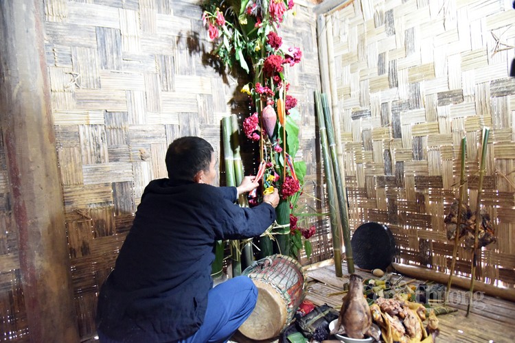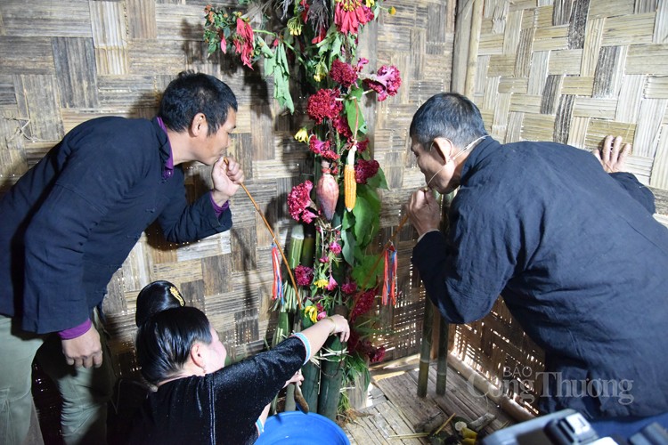 Thầy cúng bày lá mắc chắc trên một tấm phên nhỏ, lần lượt chia đều mỗi thứ đồ cúng một ít vào trong lá mắc chắc (gia đình thờ bao nhiêu người thì chia thành bấy nhiêu phần), đặt lên mỗi phần một đôi đũa rồi khấn mời tổ tiên nhận lễ, kể tên các lễ vật và cầu xin tổ tiên phù hộ con cháu khỏe mạnh, vụ sau trồng được nhiều thóc ngô, nuôi được nhiều lợn gà để dòng họ lại làm lễ tạ ơn tổ tiên.
