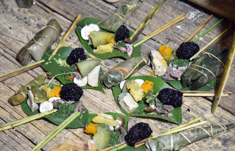 | Chia đều mỗi thứ đồ cúng một ít vào trong lá mắc chắc |
