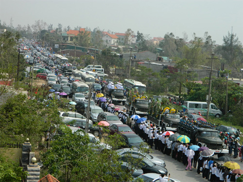 Tại bắc cầu Gianh, hàng nghìn chiếc xe ô tô đầy người đang xếp hàng dài cả chục cây số hướng về Vũng Chùa, trên hè đường cả vạn người đang huyên náo… bỗng có tiếng cất lên “Lễ an táng rồi, an táng rồi…” không khí bỗng lặng im, hàng nghìn chiếc xe không ai bảo ai cùng tắt máy. Nhiều người rời xe vào nhà dân xem trực tiếp tường thuật lễ an táng còn nhiều xe khác mở radio nghe như chứng kiến buổi lễ trước mắt. Đúng 16g08 phút khi nghe ban tổ chức tuyên bố “hạ huyệt” thì trên nhiều xe ô tô đậu giữa đường và trong nhà dân hai bên vệ đường lắm tiếng khóc dậy lên như có lửa lan truyền…