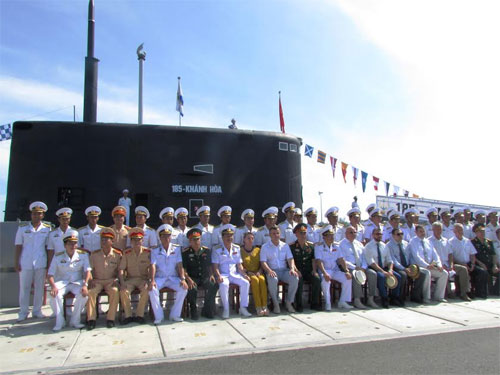 | Lãnh đạo Quân chủng Hải quân, lãnh đạo Lữ đoàn 189 và các đội tàu chụp ảnh lưu niệm với các chuyên gia Nga tham gia đưa tàu ngầm về vùng biển Việt Nam. |