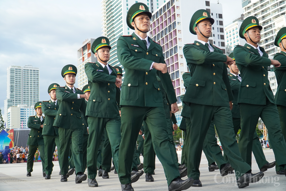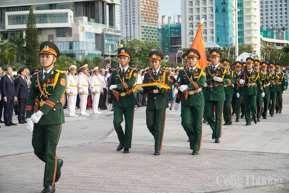 | Trên nền quân nhạc, các chiến sĩ thuộc Bộ CHQS tỉnh Khánh Hòa nghiêm trang bước lên bục để chuẩn bị thực hiện các nghi thức chính. |