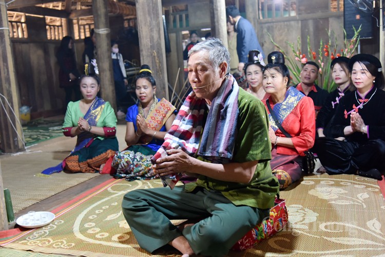 Sau đó mọi người di chuyển lên nhà sàn để thực hiện phần tiếp theo của lễ vào nhà mới. Khi gia chủ cùng con cháu và dân bản, khách dự lễ đã lên hết, một người phụ nữ lớn tuổi trong gia đình sẽ thực hiện việc thay mặt gia chủ cảm ơn khách quý đã đến chung vui với gia đình bằng việc đứng tại cửa vào nhà chính, rót rượu mời từng người.