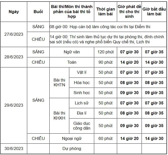| Kỳ thi tốt nghiệp THPT năm 2023 với 5 bài thi, gồm: Toán, Ngữ văn, Ngoại ngữ, Khoa học tự nhiên, Khoa học xã hội. Kỳ thi diễn ra trong 2 ngày 28 và 29/6. Bộ Giáo dục và Đào tạo cũng dành ngày 30/6 làm ngày thi dự phòng. |