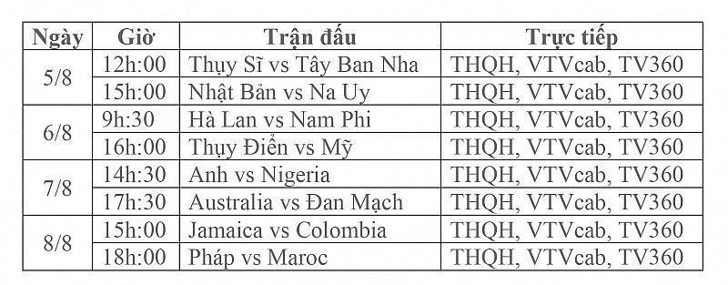 Lịch thi đấu bóng đá trực tiếp vòng 1/8 World Cup Nữ 2023 từ ngày 5-8/8/2023, sẽ được phát sóng trực tiếp trên kênh Truyền hình Quốc hội (THQH) Việt Nam (kênh 7), VTVCab, TV360.
