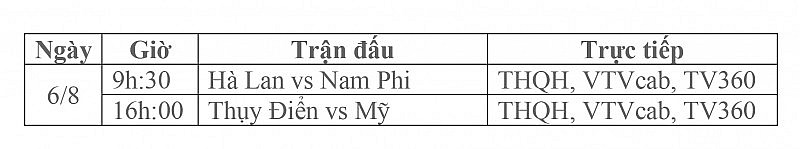 Theo đó, trận đấu sớm nhất tại vòng 1/8 World Cup nữ 2023 ngày 6/8, sẽ diễn ra vào lúc 9 giờ 30 phút giữa Hà Lan và Nam Phi; tiếp đó vào lúc 16 giờ Thụy Điển gặp Mỹ. Đây là các cặp đấu được người hâm mộ rất quan tâm và chờ đợi.
