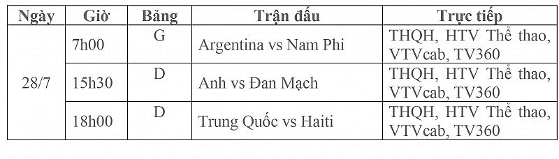Ngày 28/7, sẽ diễn ra ba trận cầu tâm điểm tại vòng bảng World Cup nữ 2023: Argentina gặp Nam Phi (Bảng G), Anh chạm trán Đan Mạch (Bảng D), Trung Quốc đối đầu Haiti (Bảng D).