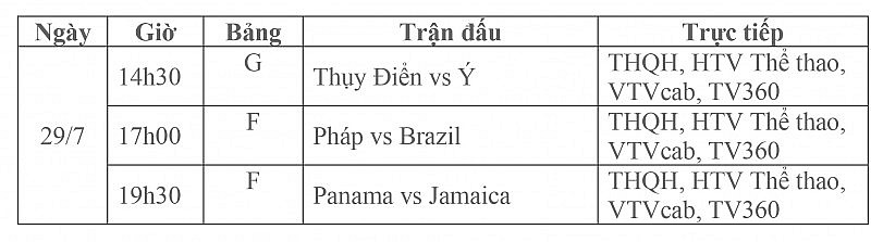 Ngày 29/7, sẽ diễn ra ba trận cầu tâm điểm tại vòng bảng World Cup nữ 2023: Thụy Điển đối đầu Italia (Bảng G), Pháp chạm trán Brazil (Bảng F), Panama gặp Jamaica (Bảng F).