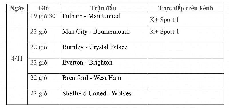 Theo đó, ngày 4/11, vòng 11 Ngoại hạng Anh mùa giải 2023/24 sẽ tiếp tục diễn ra 6 trận đấu: Fulham đối đầu Man United, Man City gặp Bournemouth, Brentford chạm trán West Ham, Burnley gặp Crystal Palace, Everton đụng độ Brighton, Sheffield United gặp Wolves. Các trận đấu này sẽ được phát sóng trực tiếp trên kênh K+ Sport 1.