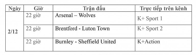 Theo đó, ngày 2/12, vòng 14 Ngoại hạng Anh mùa giải 2023/24 sẽ tiếp tục diễn ra 3 trận đấu: Arsenal chạm trán Wolves, Brentford gặp Luton Town, Burnley đụng độ Sheffield United. Các trận đấu này sẽ được phát sóng trực tiếp trên kênh K+ Sport 1, K+ Sport 2, K+Action.