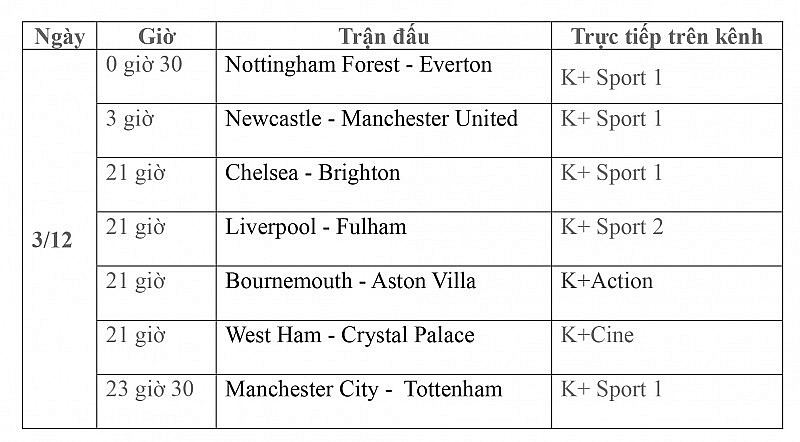 Theo đó, ngày 3/12, vòng 14 Ngoại hạng Anh mùa giải 2023/24 sẽ tiếp tục diễn ra 7 trận đấu: Nottingham Forest gặp Everton, Newcastle đối đầu Manchester United, Chelsea gặp Brighton, Liverpool chạm trán Fulham, Bournemouth đụng độ Aston Villa, West Ham gặp Crystal Palace, Manchester City chạm trán Tottenham. Các trận đấu này sẽ được phát sóng trực tiếp trên kênh K+ Sport 1, K+ Sport 2, K+Action, K+Cine.