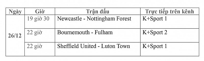Theo đó, ngày 26/12, vòng 19 Ngoại hạng Anh mùa giải 2023/24 sẽ tiếp tục diễn ra ba trận đấu: Newcastle gặp Nottingham Forest, Bournemouth đối đầu Fulham, Sheffield United chạm trán Luton Town. Các trận đấu này sẽ được phát sóng trực tiếp trên K+ Sport 1, K+ Sport 2.