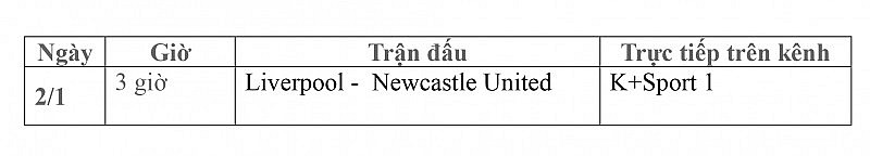 Theo đó, ngày 2/1/2024, vòng 20 Ngoại hạng Anh mùa giải 2023/24 sẽ tiếp tục diễn ra trận cầu tâm điểm: Liverpool đụng độ Newcastle United. Trận đấu này sẽ được phát sóng trực tiếp trên K+ Sport 1.