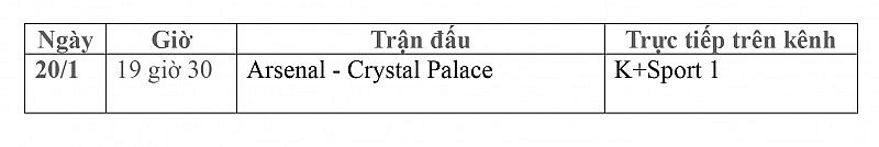 Theo đó, ngày 20/1/2024, vòng 21 Ngoại hạng Anh mùa giải 2023/24 sẽ tiếp tục diễn ba ra trận cầu tâm điểm: Arsenal chạm trán Crystal Palace. Trận đấu này sẽ được phát sóng trực tiếp trên K+ Sport 1.