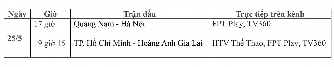 Các trận đấu tâm điểm ngày 25/5 sẽ được phát sóng trực tiếp trên kênh HTV Thể Thao, FPT Play, TV360.