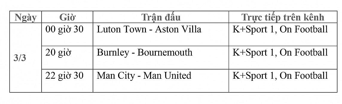 Theo đó, ngày 3/3/2024, vòng 27 Ngoại hạng Anh mùa giải 2023/24 sẽ tiếp tục diễn 3 ra trận đấu: Luton Town đối đầu Aston Villa, Burnley chạm trán Bournemouth, Man City đụng độ Man United.