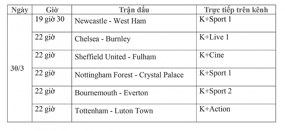 Theo đó, ngày 30/3/2024, vòng 30 Ngoại hạng Anh mùa giải 2023/24 sẽ tiếp tục diễn 6 ra trận đấu: Newcastle chạm trán West Ham, Chelsea gặp Burnley, Sheffield United đối đầu Fulham, Nottingham Forest đụng độ Crystal Palace, Bournemouth chạm trán Everton, Tottenham gặp Luton Town.