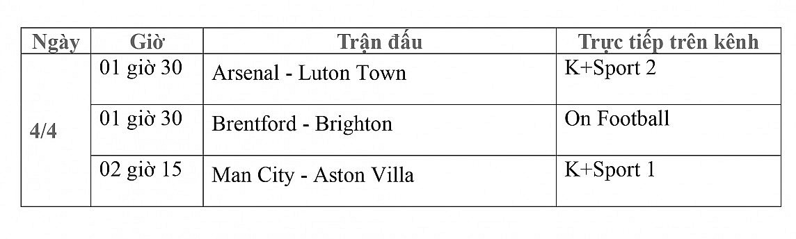 Theo đó, rạng sáng ngày 4/4/2024, vòng 31 Ngoại hạng Anh mùa giải 2023/24 sẽ tiếp tục diễn 3 ra trận đấu: Arsenal gặp Luton Town, Brentford đụng độ Brighton, Man City đối đầu Aston Villa.