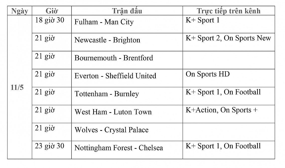 Theo đó, ngày 11/5/2024, vòng 37 Ngoại hạng Anh mùa giải 2023/24 sẽ tiếp tục diễn ra 8 trận đấu: Fulham đối đầu Man City, Newcastle gặp Brighton, Bournemouth chạm trán Brentford, Everton gặp Sheffield United, Tottenham gặp Burnley, West Ham đụng độ Luton Town, Wolves gặp Crystal Palace, Nottingham Forest đối đầu Chelsea.