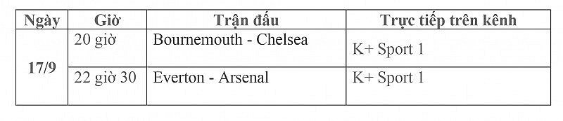 Theo đó, ngày 17/9, vòng 5 Ngoại hạng Anh mùa giải 2023/24 sẽ tiếp tục diễn ra hai trận cầu tâm điểm: Bournemouth đối đầu Chelsea và Everton chạm trán Arsenal. Hai trận đấu này sẽ được phát sóng trực tiếp trên kênh K+ Sport 1.