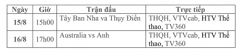 Lịch thi đấu bóng đá trực tiếp vòng bán kết World Cup Nữ 2023 từ ngày 15-16/8/2023, sẽ được phát sóng trực tiếp trên kênh Truyền hình Quốc hội (THQH) Việt Nam (kênh 7), VTVCab, HTV Thể thao và TV360.