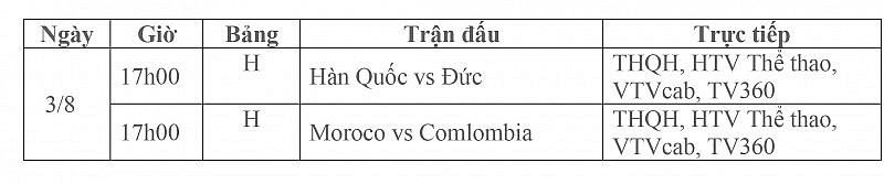 Ngày 3/8, sẽ diễn ra hai trận cầu tâm điểm tại vòng bảng World Cup nữ 2023: Hàn Quốc đối đầu Đức (Bảng H), Moroco chạm trán Comlombia (Bảng H).
