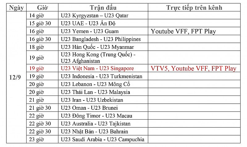 Theo đó, ngày 12/9, sẽ tiếp tục diễn ra 16 trận đấu tại 11 bảng. Trong đó, tại Bảng C sẽ diễn ra 2 trận cầu tâm điểm: U23 Yemen gặp U23 Guam và đội chủ nhà U23 Việt Nam đối đầu với U23 Singapore. Hai cặp đấu này đều diễn ra trên sân vận động Việt Trì và được truyền hình trực tiếp trên kênh VTV5, Youtube VFF, FPT Play.