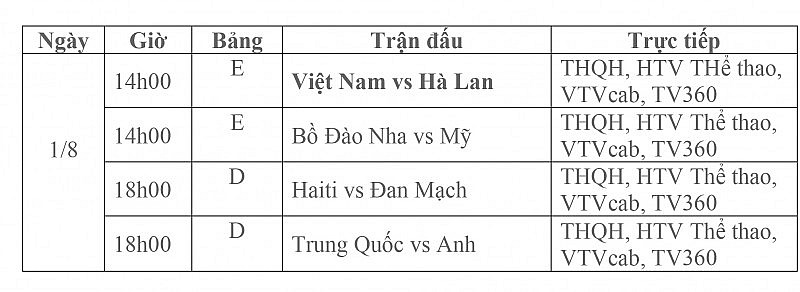 Ngày 1/8, sẽ diễn ra bốn trận cầu tâm điểm tại vòng bảng World Cup nữ 2023: Việt Nam gặp Hà Lan (Bảng E), Bồ Đào Nha đối đầu Mỹ (Bảng E), Haiti chạm trán Đan Mạch (Bảng D), Trung Quốc "đụng độ" Anh (Bảng D).