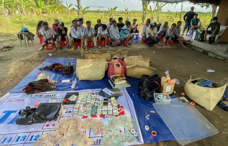 | Nhóm đánh bạc và tang vật tại hiện trường. Ảnh minh họa |