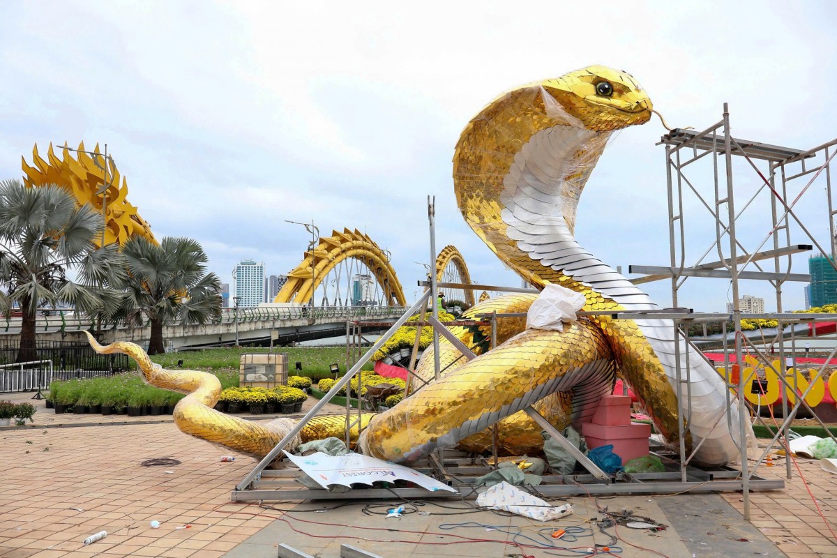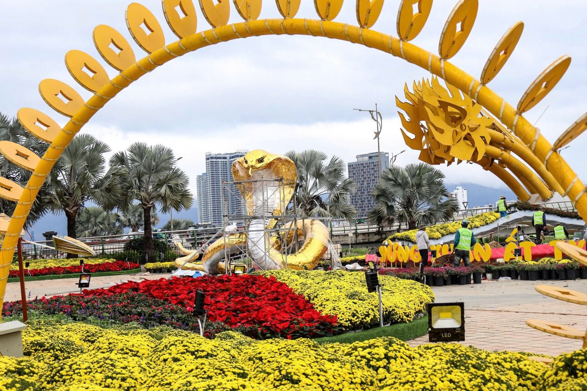 | Linh vật rắn màu vàng được bài trí ở gần cầu Rồng Đà Nẵng ở vị trí trung tâm của vườn hoa đủ sắc màu đã tạo nên không gian rộn ràng sắc xuân ở thành phố biển giàu có bậc nhất cả nước. Ảnh: Khải Hoàng |