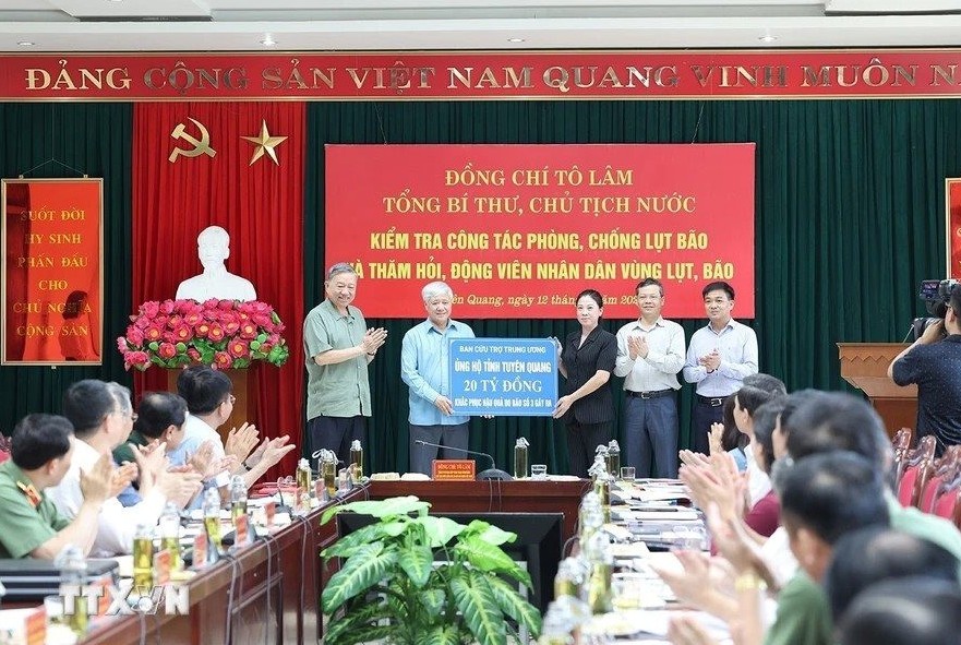 | Tổng Bí thư, Chủ tịch nước Tô Lâm chứng kiến Chủ tịch Ủy ban Trung ương Mặt trận Tổ quốc Việt Nam Đỗ Văn Chiến trao hỗ trợ đợt 1 số tiền 20 tỷ đồng cho tỉnh Tuyên Quang khắc phục bước đầu hậu quả cơn bão số 3 gây ra - Ảnh: Trí Dũng/TTXVN |