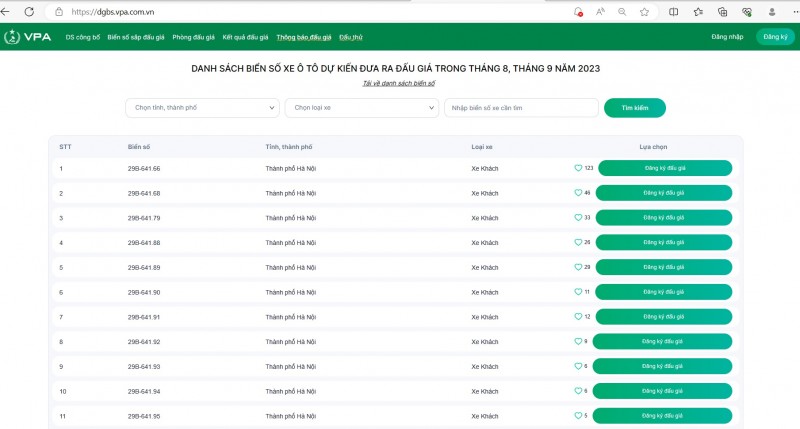 Khi đăng ký tài khoản thành công, người dân đăng nhập để bắt đầu tham gia đấu giá. Ở trang chủ, khách hàng có thể tìm kiếm biển số muốn đấu giá theo tỉnh, thành phố, loại xe và số biển cụ thể. Chọn biển xong, click vào "đăng ký đấu giá".