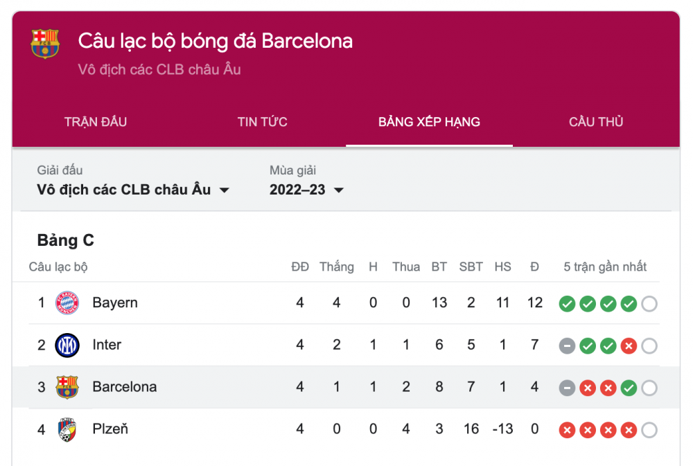 Hiện sau 4 lượt trận, Barca chỉ có được 4 điểm và xếp vị trí thứ 3 bảng C Champions League.