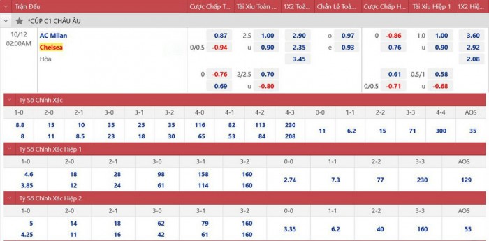 | Tỷ lệ soi kèo giữa AC Milan - Chelsea |