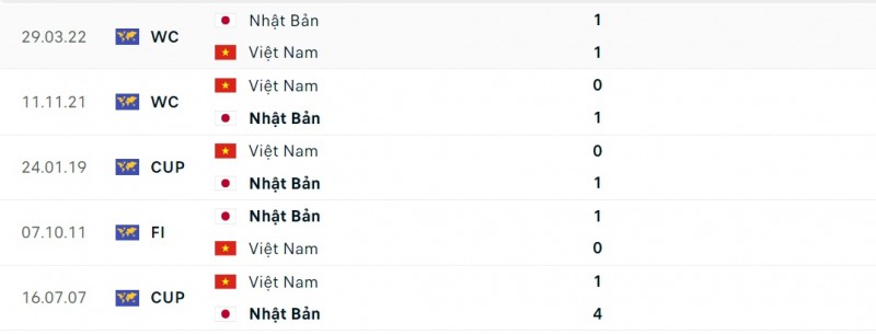 - Tuyển Việt Nam thua 4 và hòa 1 trước Nhật Bản trong 5 cuộc so tài từ năm 2007 tới nay.