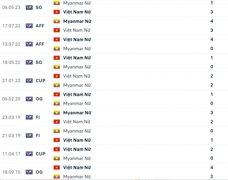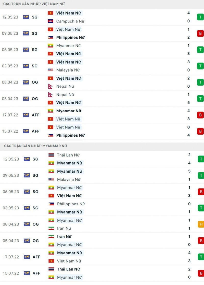 Theo số liệu thống kê, từ năm 2015 tới nay, hai đội nữ Việt Nam và nữ Myanmar đã chạm mặt nhau tổng cộng 10 lần, trong số đó các cô gái của chúng ta giành chiến thắng trong 7 trận, Myanmar thắng hai trận còn một trận khép lại với tỷ số hòa 2-2.